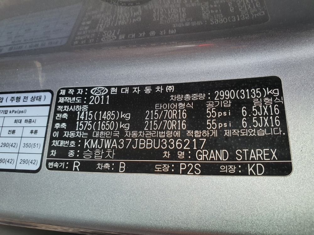 모델 Hyundai Starex 차대번호 KMJWA37JBBU336217