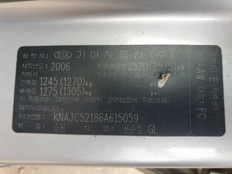 Model Kia Sorento Vehicle identification number KNAJC52186A615059