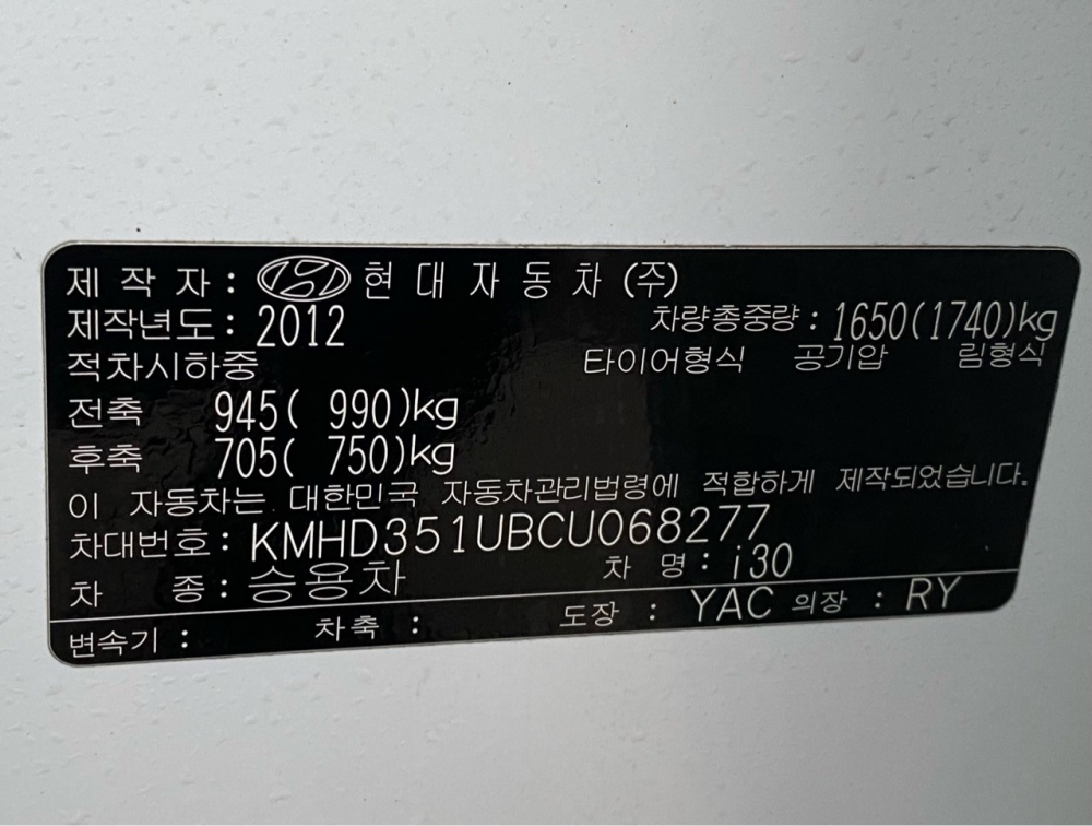 모델 Hyundai i30 차대번호 KMHD351UBCU068277