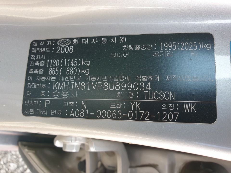 모델 Hyundai Tucson 차대번호 KMHJN81VP8U899034