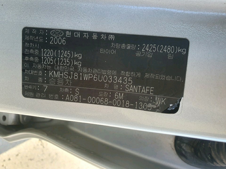 모델 Hyundai SantaFe 차대번호 KMHSJ81WP6U033435