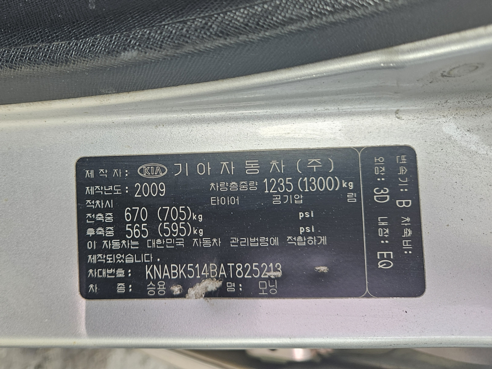 모델 Kia Morning 차대번호 KNABK514BAT825213