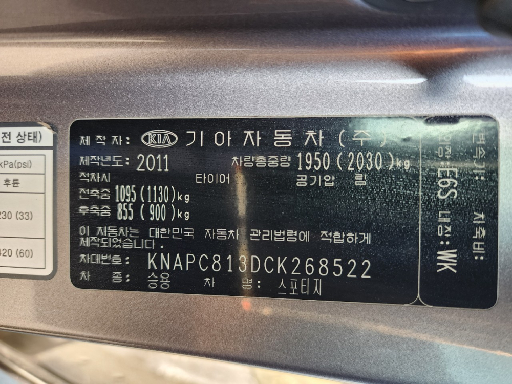 Model Kia Sportage Vehicle identification number KNAPC813DCK268522