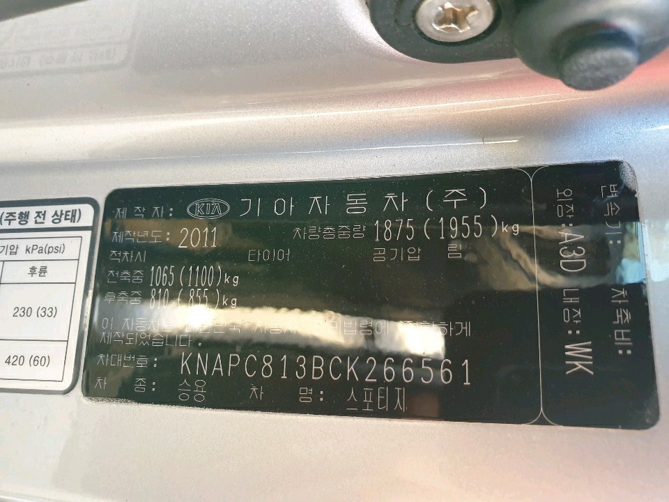 모델 Kia Sportage 차대번호 KNAPC813BCK266561