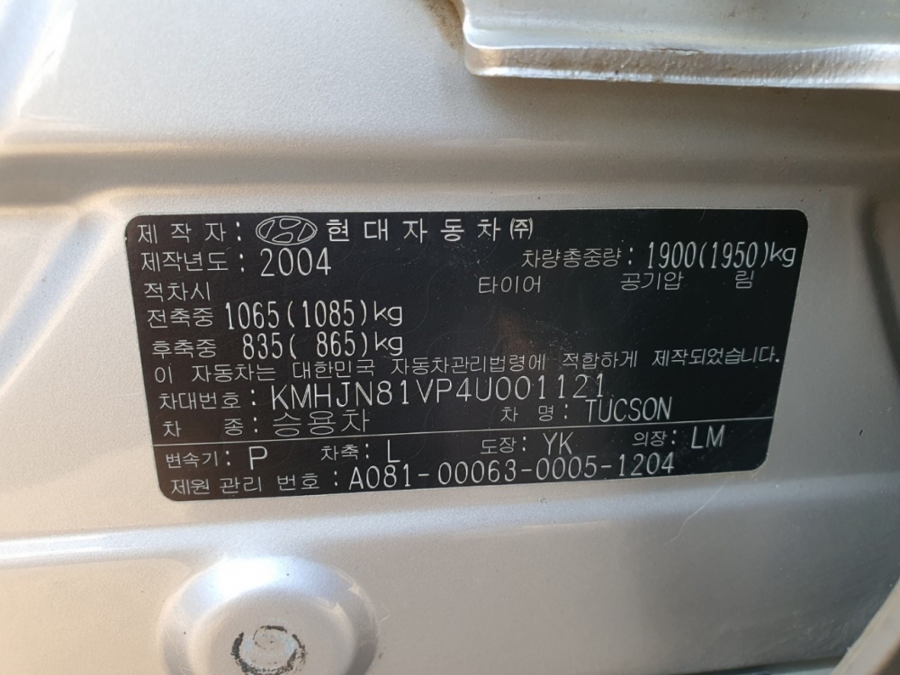 모델 Hyundai Tucson 차대번호 KMHJN81VP4U001121