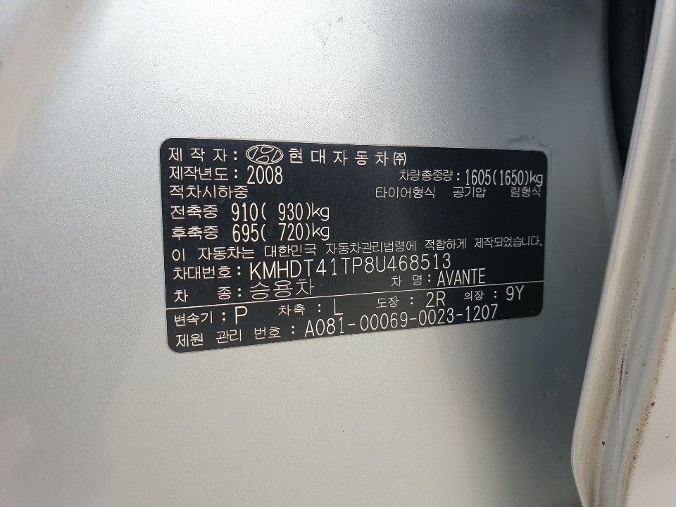 모델 Hyundai Avante 차대번호 KMHDT41TP8U468513