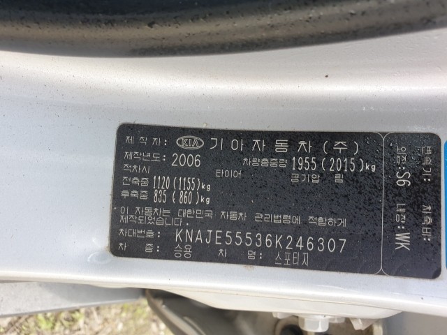 Model Kia Sportage Vehicle identification number KNAJE55536K246307