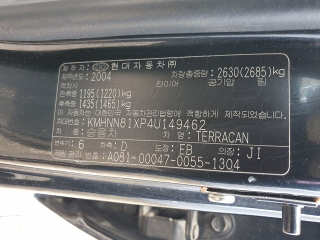Model Hyundai Terracan Vehicle identification number KMHNN81XP4U149462